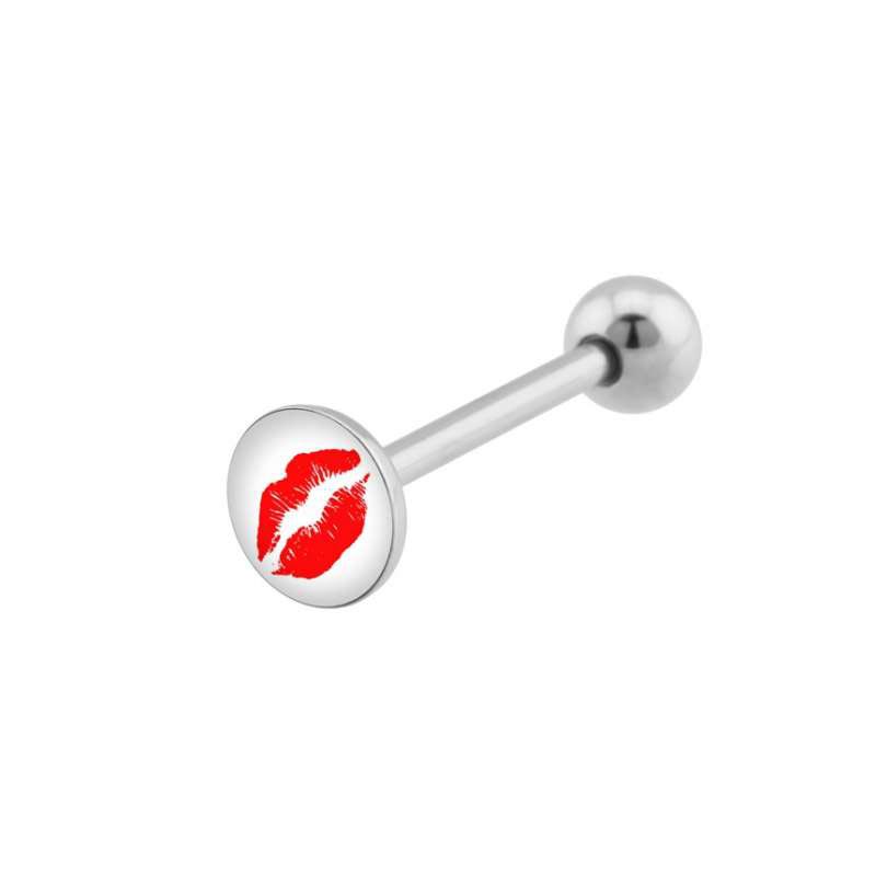 Zungenpiercing (Tongue Barbell) - Piercingstecker für die Zunge. Der Zungenstecker hat eine Schbe mit Motiv im Kuß-Design. Diese hat einen Durchmesser von ca. 7 mm und ist ca. 3 mm dick.