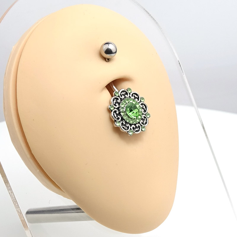 Bauchnabelpiercing im blumigen Brass Design mit vielen kleinen, grünen Steinchen besetzt