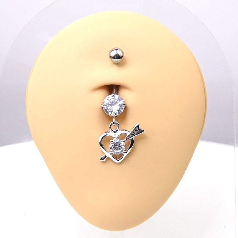Bauchnabelbanane mit zwei weißen Kristallen. Absolut höchste Qualität - Hochglanzpoliert. Dieses Bauchnabelpiercing hat einen Anhänger in Form eines Herzens mit einem Pfeil.