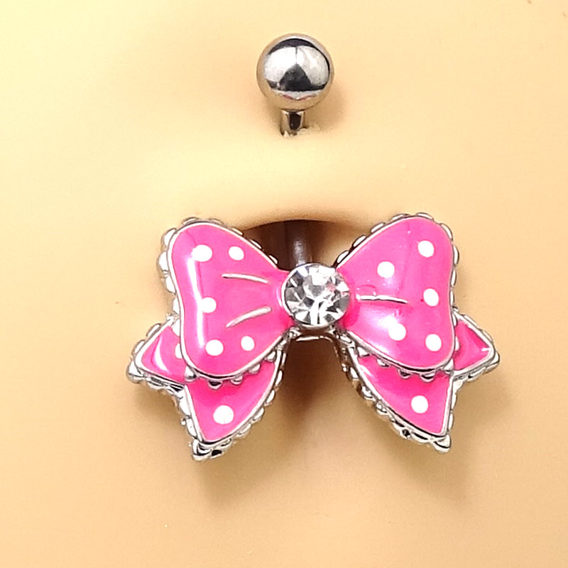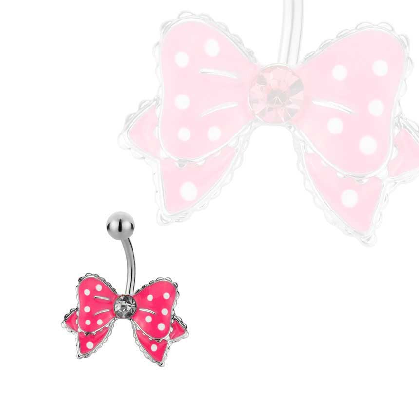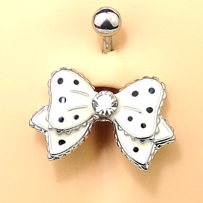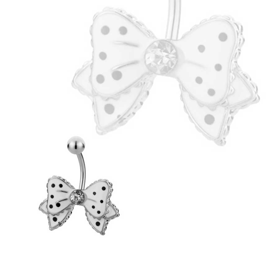 Bauchnabelstecker mit weißem (klaren) Kristall. Der Stab und die Verschlußkugel bestehen aus chirurgischem Edelstahl. Die Schleife ist im Brass Design.