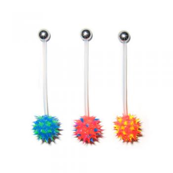 Dieser Piercingstecker ist der ideale Schmuck für den Bauchnabel bei einer Schwangerschaft. Die nutzbare Länge des flexiblen PTFE-Stabes beträgt ca. 30 mm. Der Piercingstecker kann beliebig mit einer Schere oder Messer gekürzt werden. Durch das anschließende Aufschrauben der Verschlußkugel schneidet sich das Gewinde erneut selbst. Wir empfehlen auf der Seite der kleinen Verschlußkugel zu kürzen. Diese läßt sich dann leichter drauf schrauben als die große Kugel. Die Möglichkeit diesen Bauchnabelschmuck beliebig kürzen zu können,hat den Vorteil, daß dieser auch noch nach der Schwangerschaft getragen werden kann. Die große Kugel besteht aus Kunststoff - umhüllt mit Silikon, welches an der Oberfläche zu vielen feinen, weichen Spitzen geformt ist.