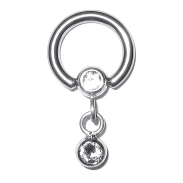 Dieser Artikel besteht aus hochwertigem Titan und hat eine Materialstärke von 1,6 mm und einen Innendurchmesser von 8 mm. Beide Kugeln haben einen Durchmesser von 4 mm und sind mit je einem klaren Swarowski-Kristall besetzt. Dieser Ring eignet sich sehr gut als Ohrpiercing oder für den Intimbereich als Intimschmuck, wie beispielsweise für ein KVH-Piercing oder für die kleinen Schamlippen.